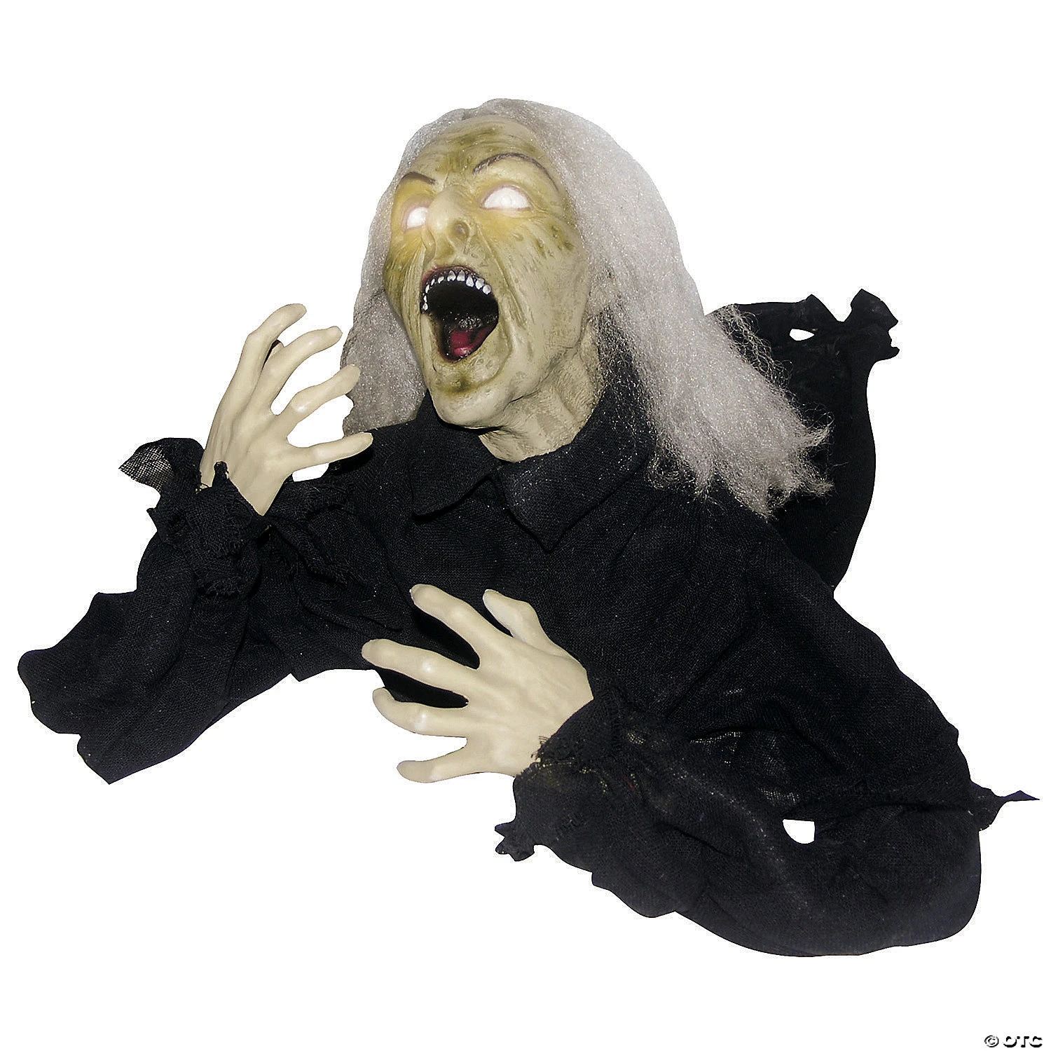 This bewitching Halloween prop has light-up eyes and a head that turns back and forth, ready to meet and greet trick-or-treaters and Halloween party guests! Her mouth is open in a perpetual silent scream, and her gruesome, green-skinned face is topped with a mop of ragged, frizzy white hair. Positively terrifying! Requires 3 “AA” batteries, not included. Sound activated.