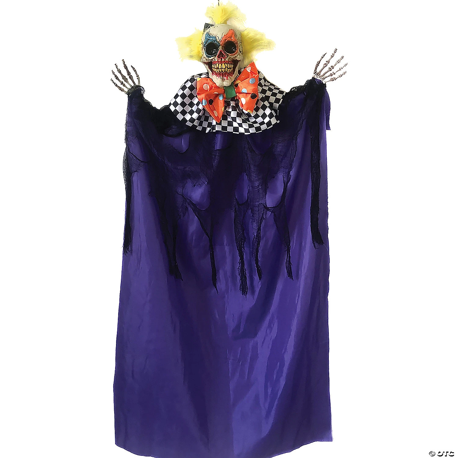 With his Bright Orange Bow Tie and checkered Collar, you can’t miss this colorful 35-Inch Hanging Clown! He has a Skull Face with Red and Blue Makeup and Yellow wispy Hair. His Posable Arms end in skeleton Hands, and his long Purple Drape clothing has a sheer Black gauzy layer to sway in the breeze. Fun accessory for your next Haunted Scene or Home Haunt.