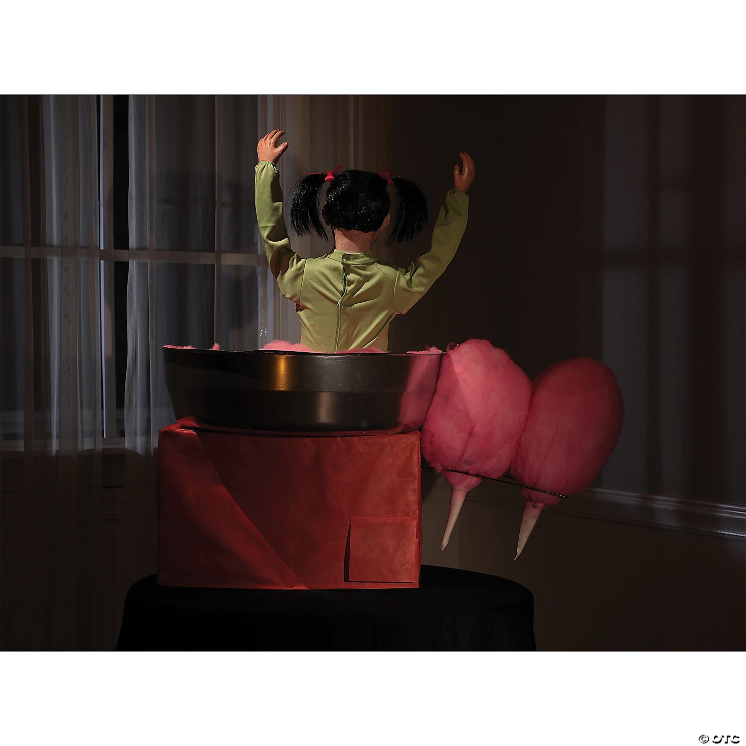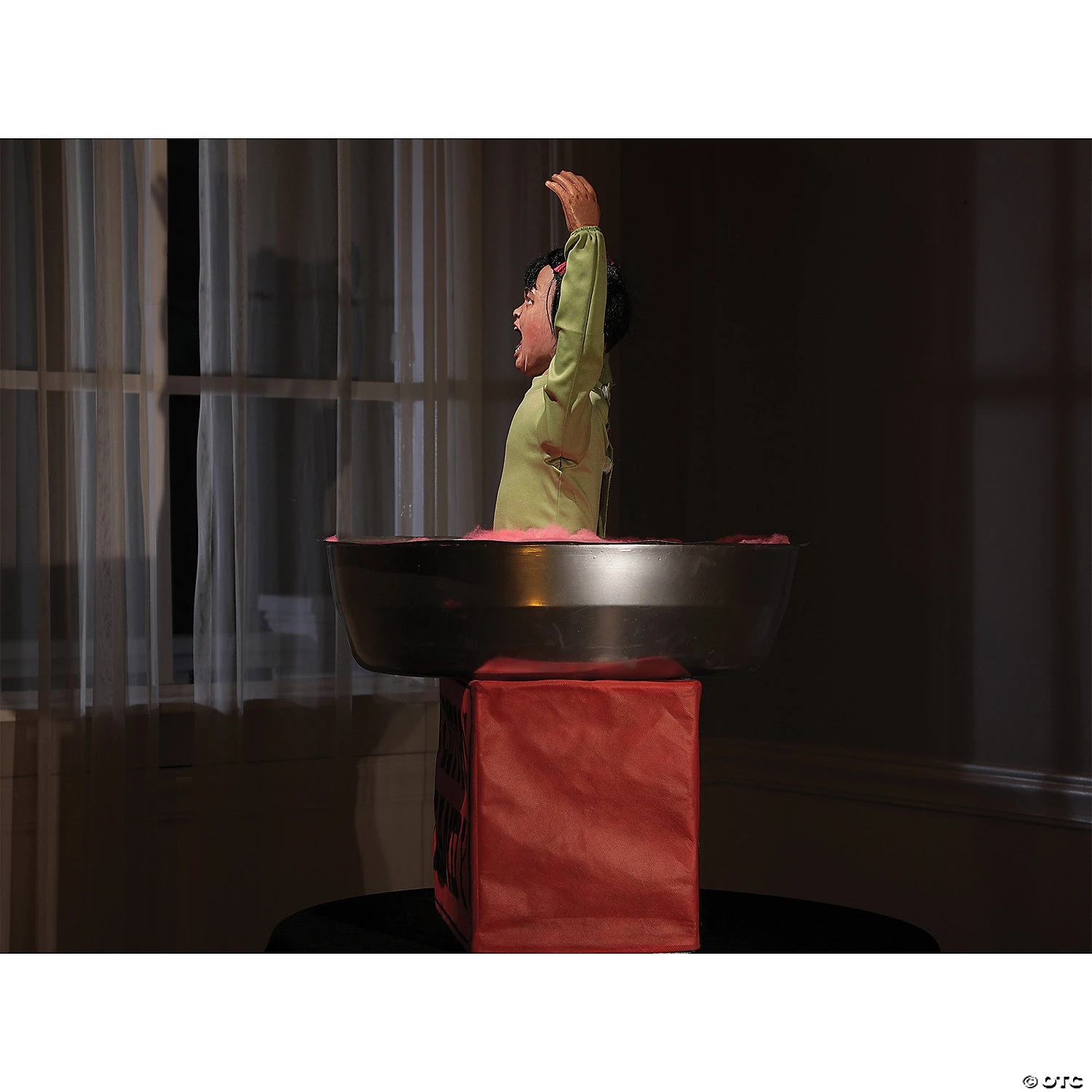 Round and round she goes where she stops, no body knows! Cotton Candice’s love of sweet treats has caught her in a sticky situation that is spinning out of control! With her hands held high and vibrant carnival music playing, she Screams in Terror as a small motor twirls her around. The Cotton Candice Animated Prop’s Set-up is a breeze with Metal Connecting Poles that lock in place and a Simple AC power cord that plugs into the wall. Cotton Candice is an ultra lightweight animated prop that can be placed on a counter or table top as needed to suit your display.Three activation options include, Steady-On, Infra-red Sensor, or Step-Here Pad. There is also a Volume Control so you can adjust to your surroundings. The Included Universal Adapter has 4 changeable plugs and works in USA, UK, Germany and Australia. Polyester, plastic, metal and electronics. 36″ tall x 20″ wide x 10″ deep
