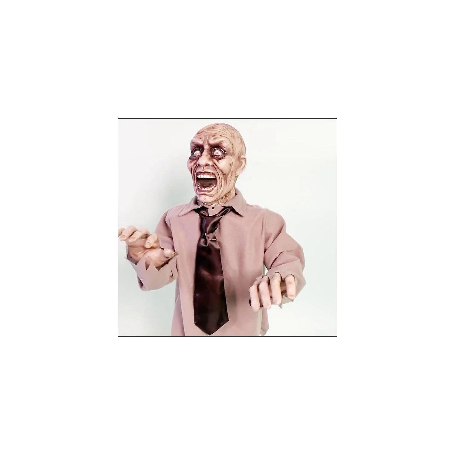 Place this scary fellow at your door and watch what happens. This Twisting Zombie will cause your visitors to shout! The Twisting Zombie moves from side to side as he turns his head and screams. His arms move with him, however they do not bend. Mr. Zombie is 12″ in length, 8.75″ wide and 36″ tall and weighs 2.2lbs . He is constructed of latex and has a sturdy frame. He has the finest of cloths made of polyester. Twisting Zombie comes with easy to assemble directions and can be stored easily for years to come. Twisting zombie that appears to be looking for his next victim. Posable arms allow different looks. Battery operated. Indoor use only.Special Shipping Information: This item ships separately from other items in your order. This item cannot ship to a P.O. Box. This item may be subject to additional processing days.ITEM IS NOT ELIGIBLE FOR EXPEDITED SHIPPING