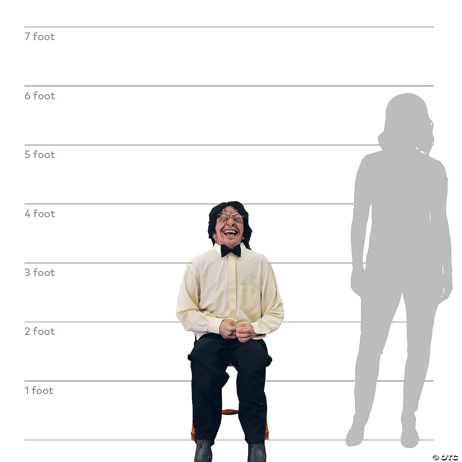 Life-sized animated prop depicts a creepy man who shakes with crazy laughter! Just the right prop to accent your haunted scene! Made of foam-filled latex, this full-standing figure includes a CD with scary sounds. Just provide your own boom box. Prop plugs into any 110 outlet. Chair is not included.