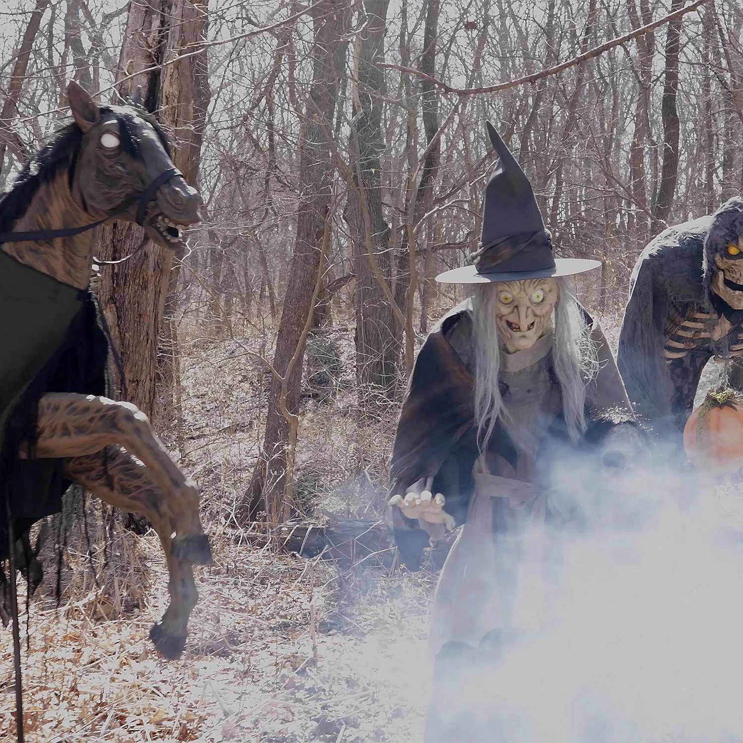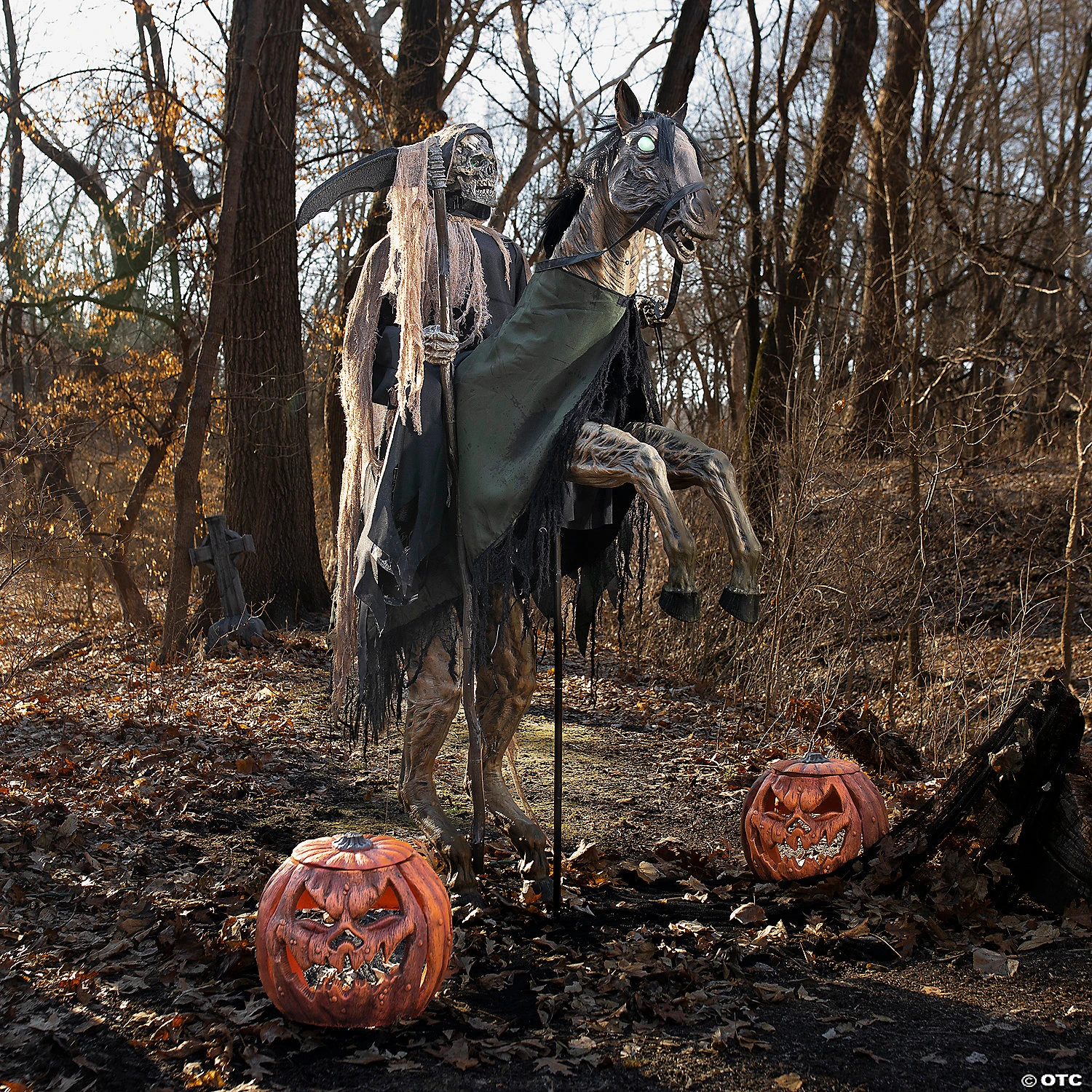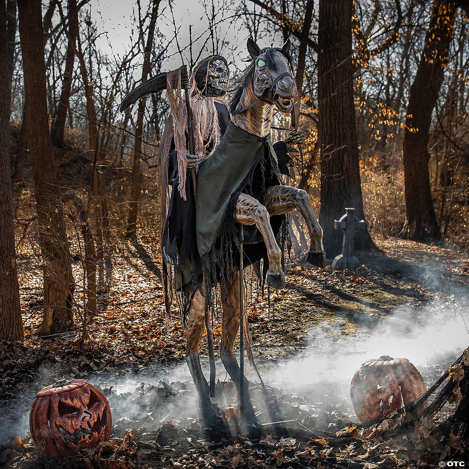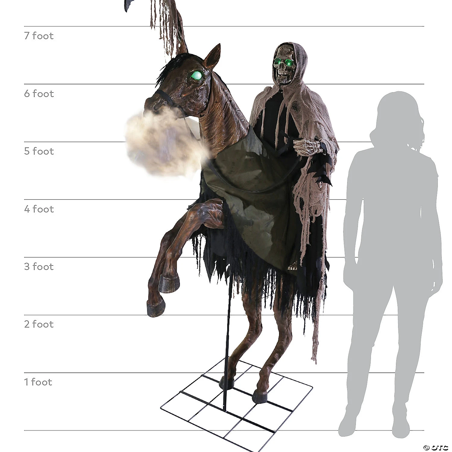 Galloping in from beyond the veil is The Reaper’s Ride Animated Prop. Wearing a black robe with shredded gauze and carrying a long scythe, the Reaper sits atop an eerie steed from the underworld. Once activated, the Reaper’s mouth moves as he says one of six phrases as the horse bucks its head and kicks its front legs. For an added chilling effect, connect the included hose and connection cable to your fog machine (not included) to have fog flow out from the horse’s mouth! Choose from Steady-On, Infra-Red Sensor or Step Here Pad (included) activation options to operate. The infra-red sensor works up to 6.5 feet away and works in all lighting conditions bright light to no light! Item includes volume control. Easy-to-assemble quick-connect poles. Indoor or covered porch use only.