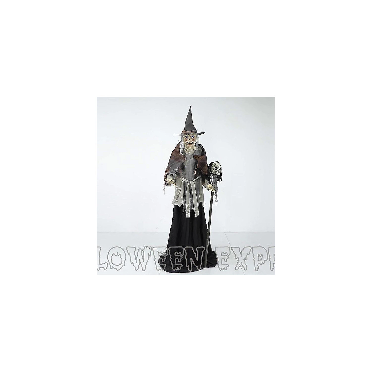The Glowing Eyes of the 72-inch Lunging Digiteye Witch Animated Prop are brought to life digitally with patented Digiteye technology! She lunges at unsuspecting people as they pass by, reaching out with a gnarly hand as if to drag them into her cold embrace. Her other hand hold a creepy skull-topped staff! Her face is made of artfully sculped latex with a Moving Mouth that adds a life-like look to an already incredibly realistic Animatronic Prop. With a crackling Voice she Speaks one of Four spine-tingling Phrases:Phrase #1: “Well hellooo! You don’t happen to have some candy for a sweet little old lady do you? Give it to me!! You’re too fast for me, but I’ll get it next time, ah haha haha ha.”Phrase#2: “Do you not fear ugly witches? Perhaps you should, since one poisonous touch from me will wither your soul- Gotcha! ah hahahaha! Ah, you escaped my grasp, for now!”Phrase #3: “Want to play a game of tag? If I catch you, I get to turn you into a Toad! Abra Cadabra! Ooh, drat! Judging by the speed you jumped back, perhaps you are part Toad already! He he he!”Phrase #4: “Excuse me, can you help a sweet old lady find her cauldron? I can’t seem to find it anywhere. I GOT YA!! Ooh, he he he! Oh, if you weren’t so fast, you’d be in my cauldron right now!”Phrase #5: “(assorted laughs and cackles)”Three activation options include, Steady-On, Infra-red Sensor, or Step-Here Pad. There is also a Volume Control so you can adjust to your surroundings. The Included Universal Adapter has 4 changeable plugs and works in USA, UK, Germany and Australia.