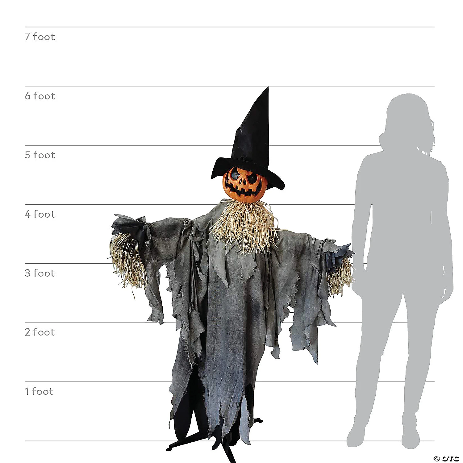 Distressed worn ashy colored robes raggidly hang of the corpse of a wicked scarecrow. Straw protrudes from its hand and neck openings in a natural way giving it an aged appearance. It sits on an easy to assemble 4 pronged stand with 3 interlocking poles that hold it upright. The sound activation option included is sure to catch even the most warry off gaurd for a surprise scare. Being battery powered allows the Scarecrow to easily be placed most anywhere inside and in sheltered outdoor areas. Come see what all the screams are about!