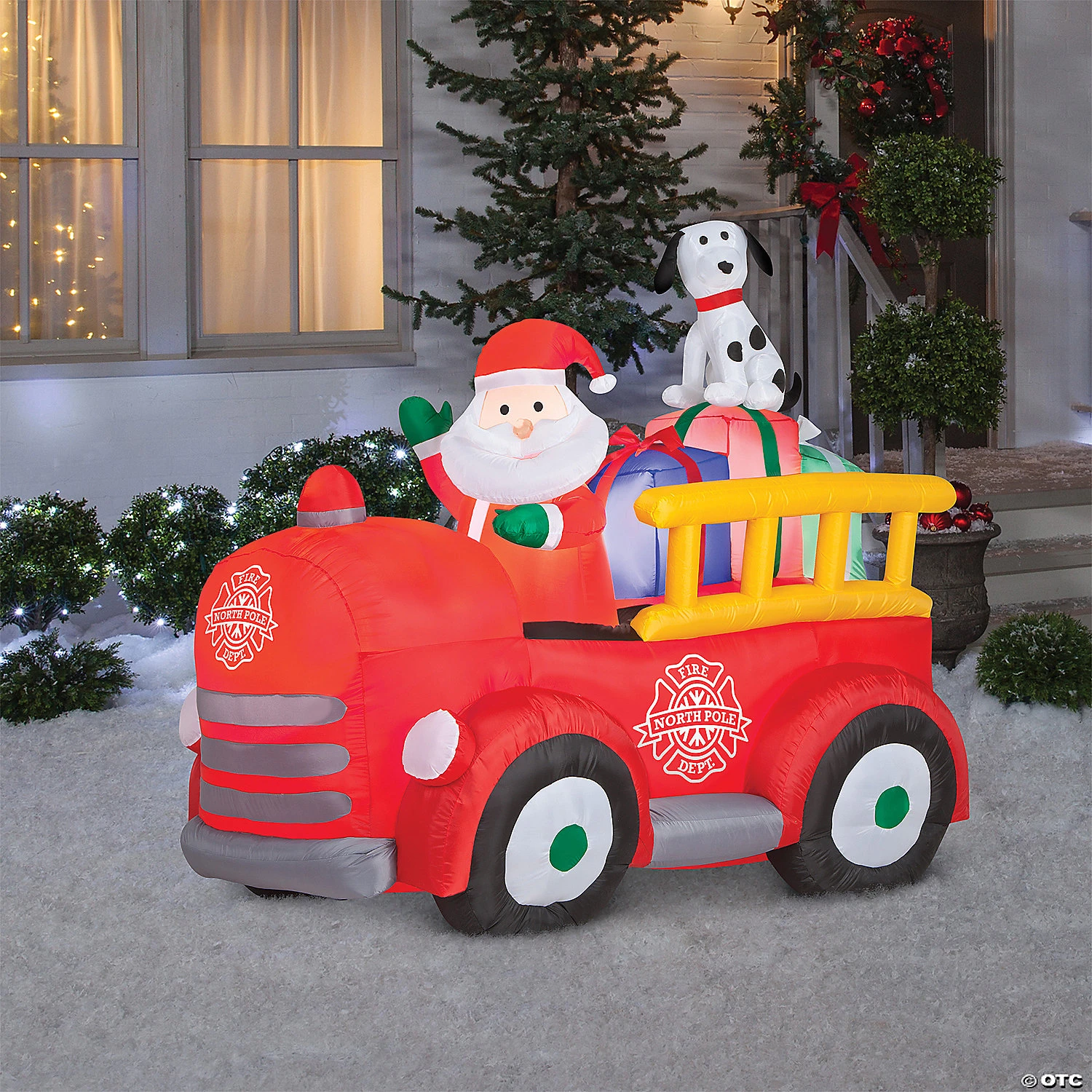 Holiday spirit will be on fire when you display this adorable Airblown Santa in a Vintage Fire truck.This easy to inflate Airblown comes with everything needed to inflate, display and secure Santa and his dalmatian pup outdoors. Once inflated, the energy efficient LED lights omit a soft glow. The Airblown is easy to deflate and store for many Santa visits to come.-Energy-efficient LED lighting-Self-inflates in seconds-Comes complete with Stakes and tethers for easy installation-Outdoor UseSpecial Shipping Information: This item ships separately from other items in your order. This item cannot ship to a P.O. Box. This item may be subject to additional processing days.ITEM IS NOT ELIGIBLE FOR EXPEDITED SHIPPING