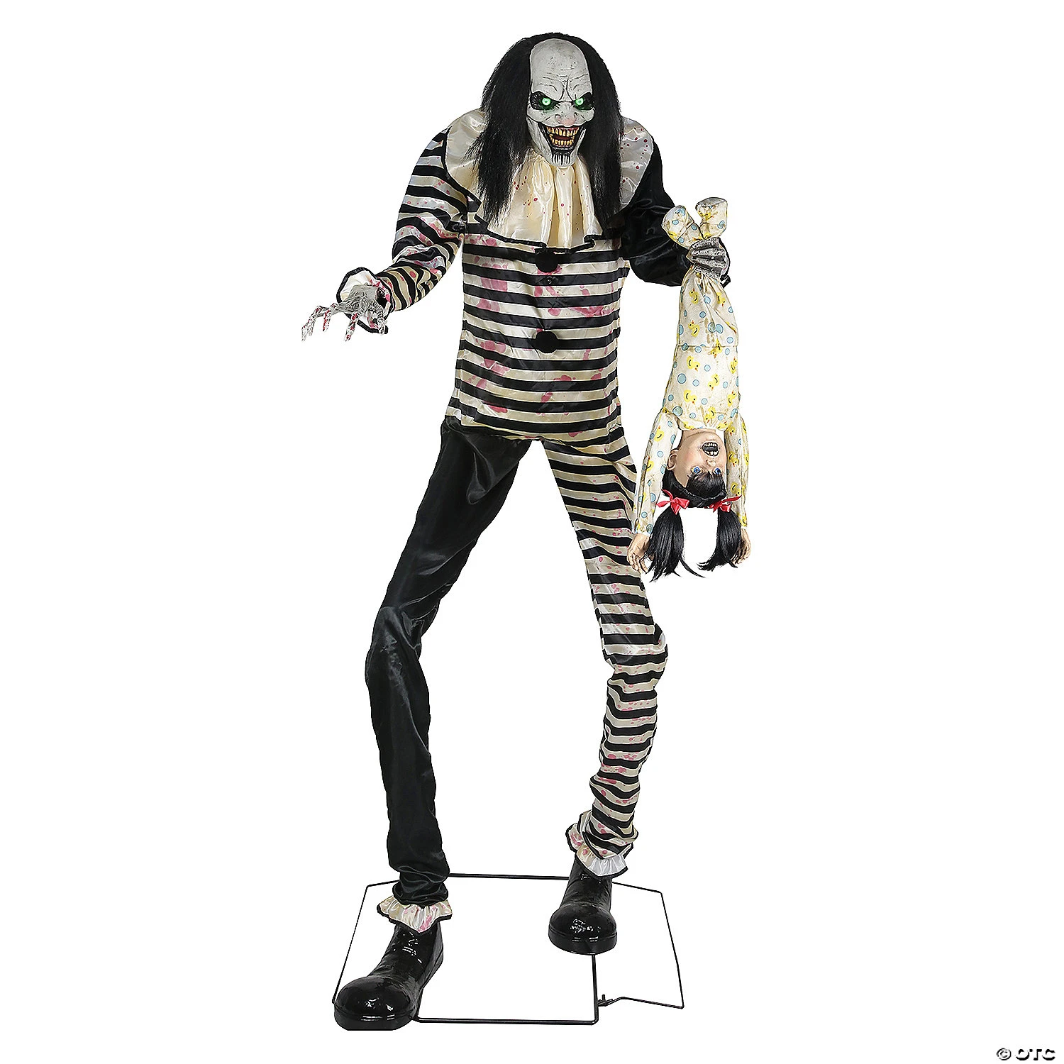 This intimidating 7-foot tall animated towering creep features an easy-to-assemble metal frame long black hair black & white striped costume and large black clown shoes. He has two creepy elongated hands one of which is holding a small child by the feet! The Sweet Dreams Clown’s eyes will glow with green glee and his head and torso turns side-to-side while he says one of 3 terrifying sayings ( inchesmaniacal laughter inches inchesOh look what I have screams), a new volunteer for my juggling act! (child screams) Looks like I have a live one (child screams) – but not for long hehehe! (child screams) inches, inchesWakey wa and shine sleepy head! (child screams) This should teach you to always look under your bed! (child screams) And in your closet hahah! (child screams) inches) as the screaming child holding by the feet screams and flails about! Plug the UL power adapter into any standard outlet and choose from Steady-On, Infra-Red Sensor or Step Here Pad (included) activation options to operate. The infra-red sensor works up to 6.5 feet away and works in all lighting conditions – bright light to no light! Item includes volume control. Easy-to-assemble with quick-connect poles. Assembly is required. Materials: 40% Iron, 8% PVC, 2% Electronic, 30% Polyester, 20% Cotton. For indoor or covered-porch use only. This clown might be available for your next birthday party – whether you want him or not!Special Shipping Information: This item ships separately from other items in your order. This item cannot ship to a P.O. Box. This item may be subject to additional processing days.