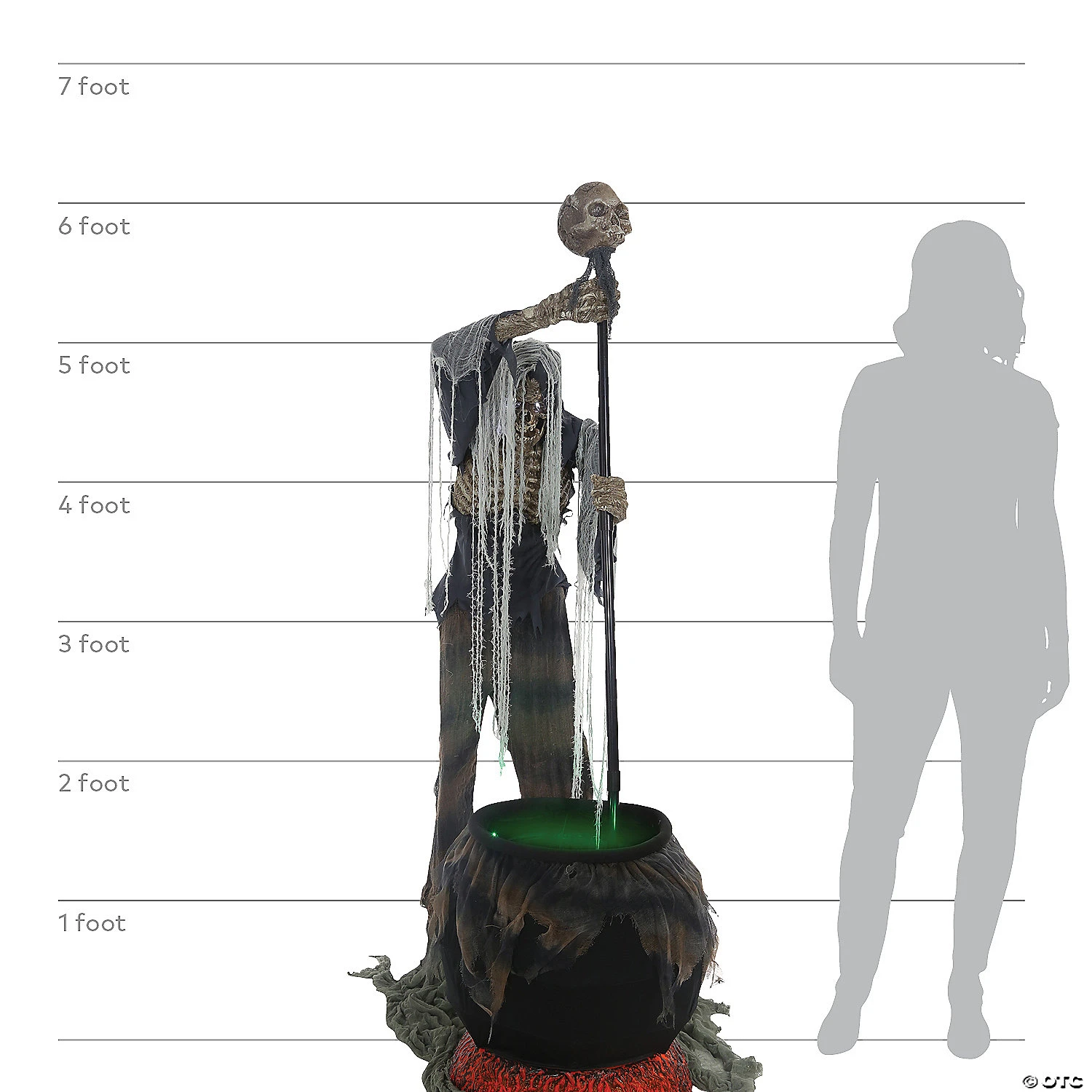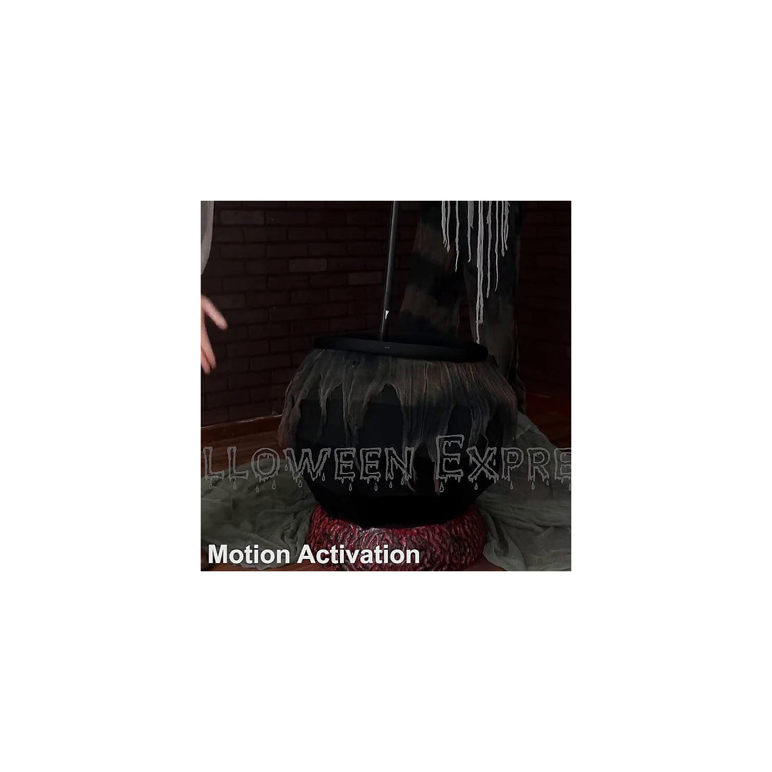 The 72 inch Cauldron Creeper Animated Prop loves stirring his stew – and wants to have you for dinner! He is wearing a tattered costume with long shredded-gauze accents.Featuring PVC head with hinged jaw, hands and chest with such realistic sculpted details you have to see to believe he’s not real – truly disgusting! Plug the UL power adapter into any standard outlet and choose from Steady-On or Infra-Red Sensor or Step Here Pad (included) activation options. Once activated this rotting corpse’s eyes will glow as his head raises and lowers while he slowly stirs the brew with his long staff topped with a rotting plastic skull in his glowing green cauldron withthe burning embers beneath it glow! He hasthree sayings (“(evil laughter) “, “The pot, I’ve put me flesh in, now I’ve naught. I’ll let it simmer ’til bubbling brew, and when it’s ready I’ll come find you! He heh heh”, “Ah, this is thickening,yessss. Heh heh, this cauldron is full of tasty morsels I have found. Would you like to give it a try? It’s Halloween, ANYTHING can happen this night! Heh Hah!”.Attach the optional Fog Hose (included) to your Fog Machine (not included) to add fog coming out of the cauldron to complete the spooky effect. The infra-red sensor works up to 6.5feet away andworks in all lighting conditions – bright light to no light! Includes volume control. Easy-to-assemble quick-connect poles. Assembly required. Materials: 40% Iron, 8% PVC, 2% Electronic, 30% Polyester, 20% Cotton