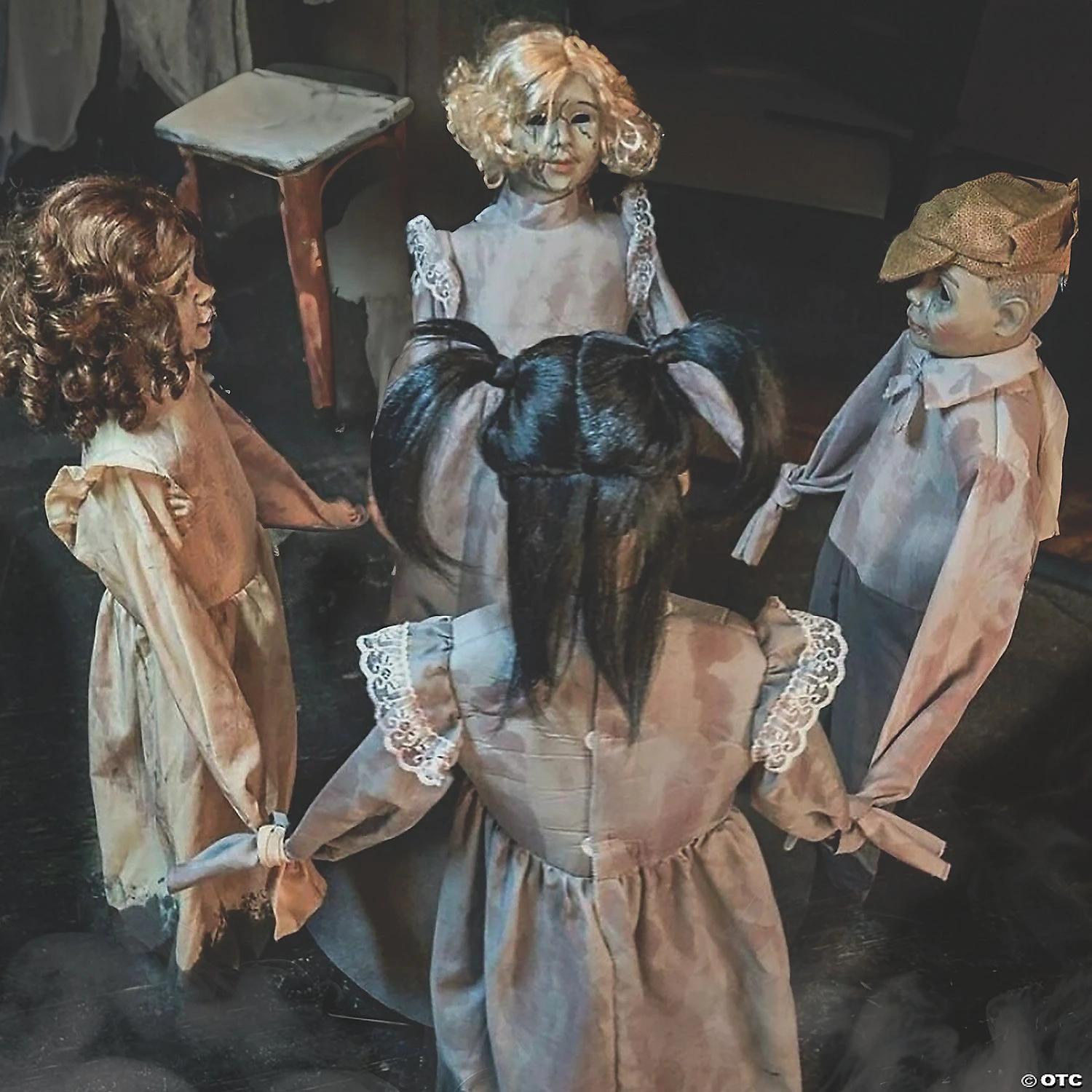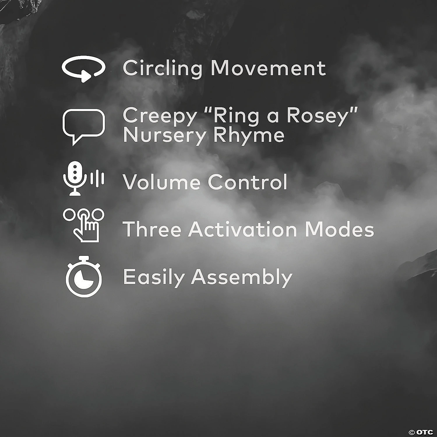 With our melancholy Ring Around The Rosie Animated Prop, 4little Friends hold hands and sing the old “Ring a Rosey”rhyme wearing old turn of the century clothing while circlingendlessly. After the verse you hear echoing Childish Laughter and they begin to sing again. Plug the UL power adapter into any standard outlet and choose from Steady-On, Sound Sensor, or Step-Here Pad (included) activation options. Includes Volume Control.Easy-to-assemble with quick-connect metal poles.