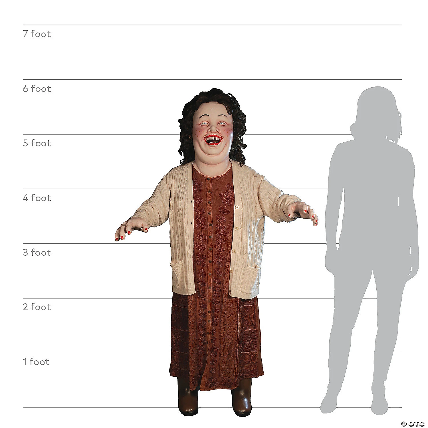 Animated Sally Halloween Prop. Bigger than life, Sally giggles as she wiggles.. but still is a little bit creepy! Just plug her in and watch as she moves and laughs! This animated prop features: Sally is approximately 70″ tall. Includes Soundtrack on CD to play in your CD player. Costuming may vary. Made of Latex and foam with metal armature. Requires AC Power to operate.