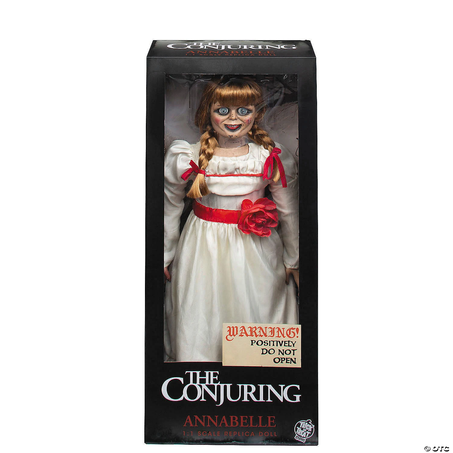 The Conjuring Annabelle Doll Prop. Everyone who loves horror movies knows the story of Annabel Higgens. Doll measures 40″ tall, comes fully clothed and holding her Miss Me paper in her handcome in collectors window box. 2019 Warner Bros. All right reserved.