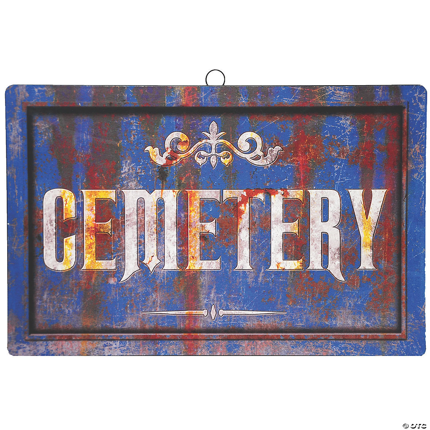 Add a chilling touch to your haunted graveyard or tombstone scene with this spooky looking Metal Cemetery Sign. This creepy sign will be a great addition to your Halloween home décor or yard display. This blue metal Cemetery sign with red blood-like staining will add an old and distressed feel to your haunted graveyard scene. This metal Cemetery sign has a hook on back for easy hanging. Measures 17” L x 11” W. This item cannot ship to a P.O. Box. This item may be subject to additional processing days.ITEM IS NOT ELIGIBLE FOR EXPEDITED SHIPPING