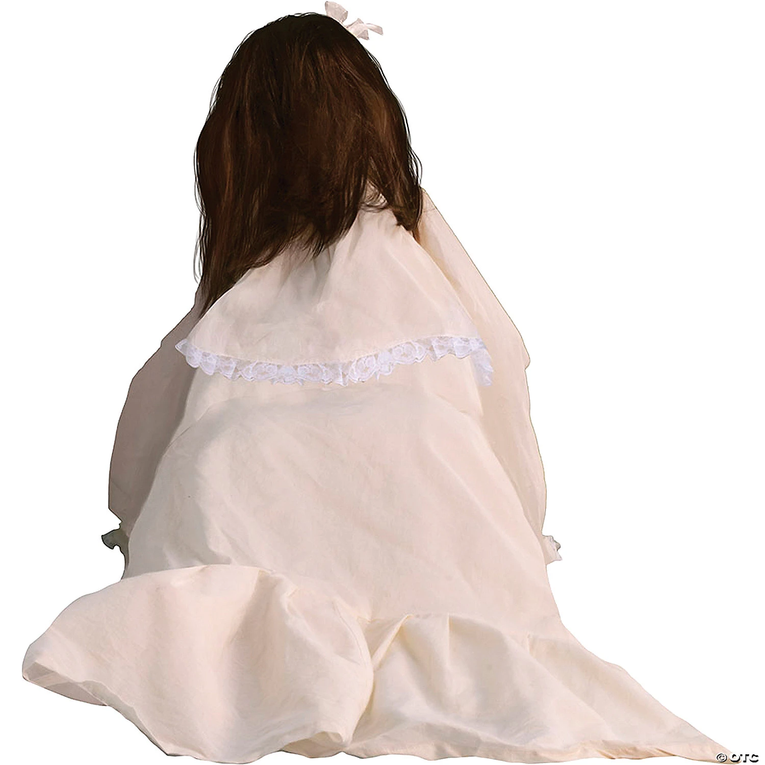 Bone-chilling Crawling Possessed Girl will scare the yell out of you! She has a lace-trimmed nightgown and bow ribbons in her hair.. From her crawling position, she sings a little song, then suddenly has a demonic attack! Her Head Snaps backwards, her Eyes Light Up with aglowing White Light, and she lets out a wild Screech! Afterwards, she slowly returns to her original position. Battery or Adapter operated, for indoor use only. Perfect for your Haunted Scene.
