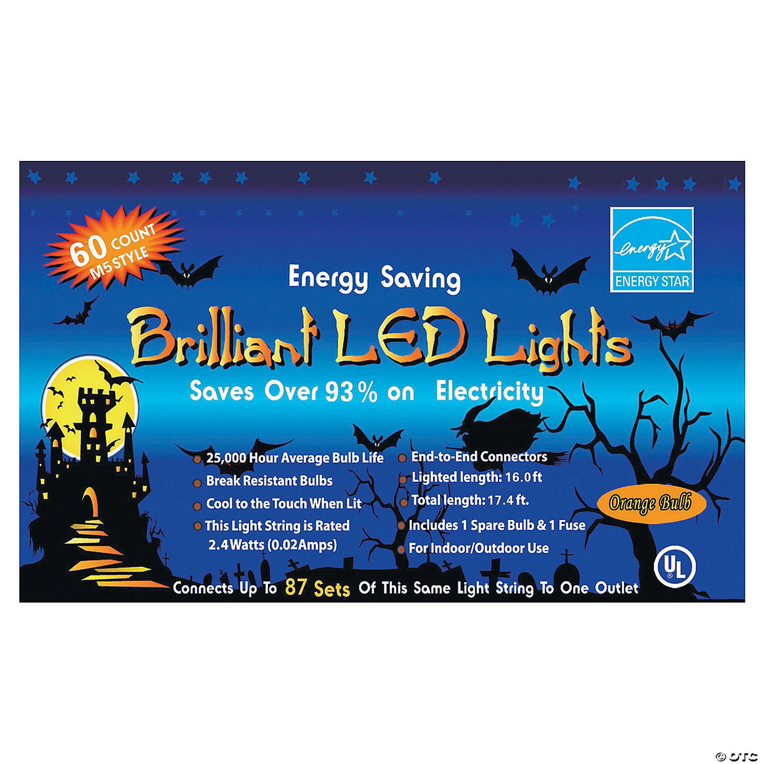 Enhance your indoor or outdoor Halloween decorations by letting the glow of these lights shine! This string of orange lights is a must-have if you enjoy creating a haunting atmosphere through Halloween lights! 12″ lead, 4″ cut and 4″ end. 16 ft. lighted length. Includes 1 spare bulb and 1 fuse.