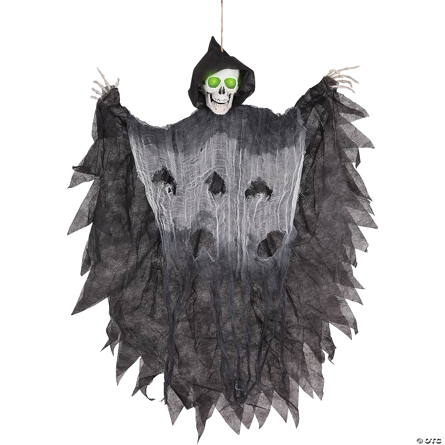 One of the fearsome hanging props you have ever seen! Will make your home haunt or haunted house one of the most talked about this season! Skull head with skeleton hands and a tattered-cut robe that looks very wide. Very spooky looking. On/off switch. Uses 3 LR44 watch batteries (not included). Keep away from children flame and direct heat sources. 35.5 x 27.5 x 4.