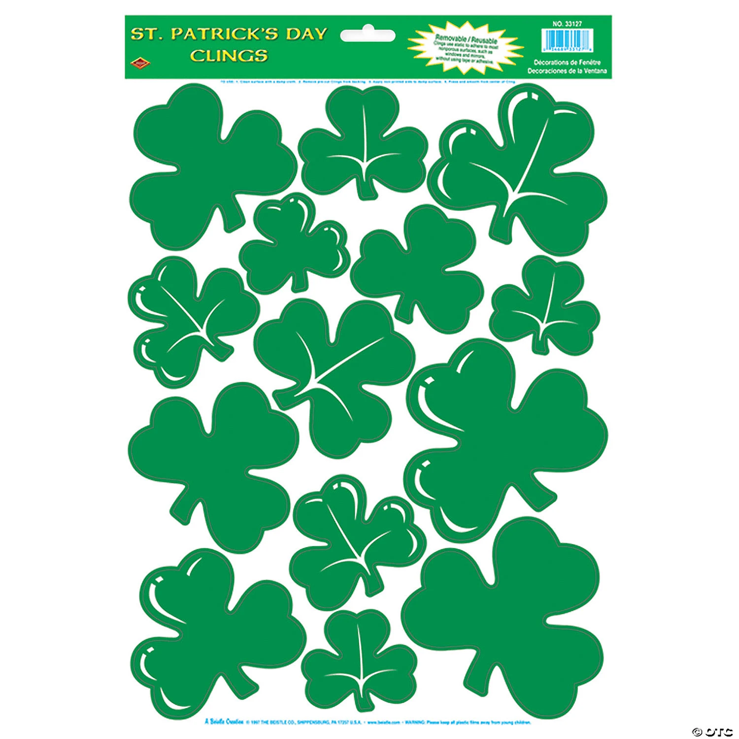Shamrock Clings. Clings are a must have for St. Patrick’s Day! Put them up on mirrors and windows. They are green shamrocks with white highlights. Assorted sizes. 14 clings per sheet.