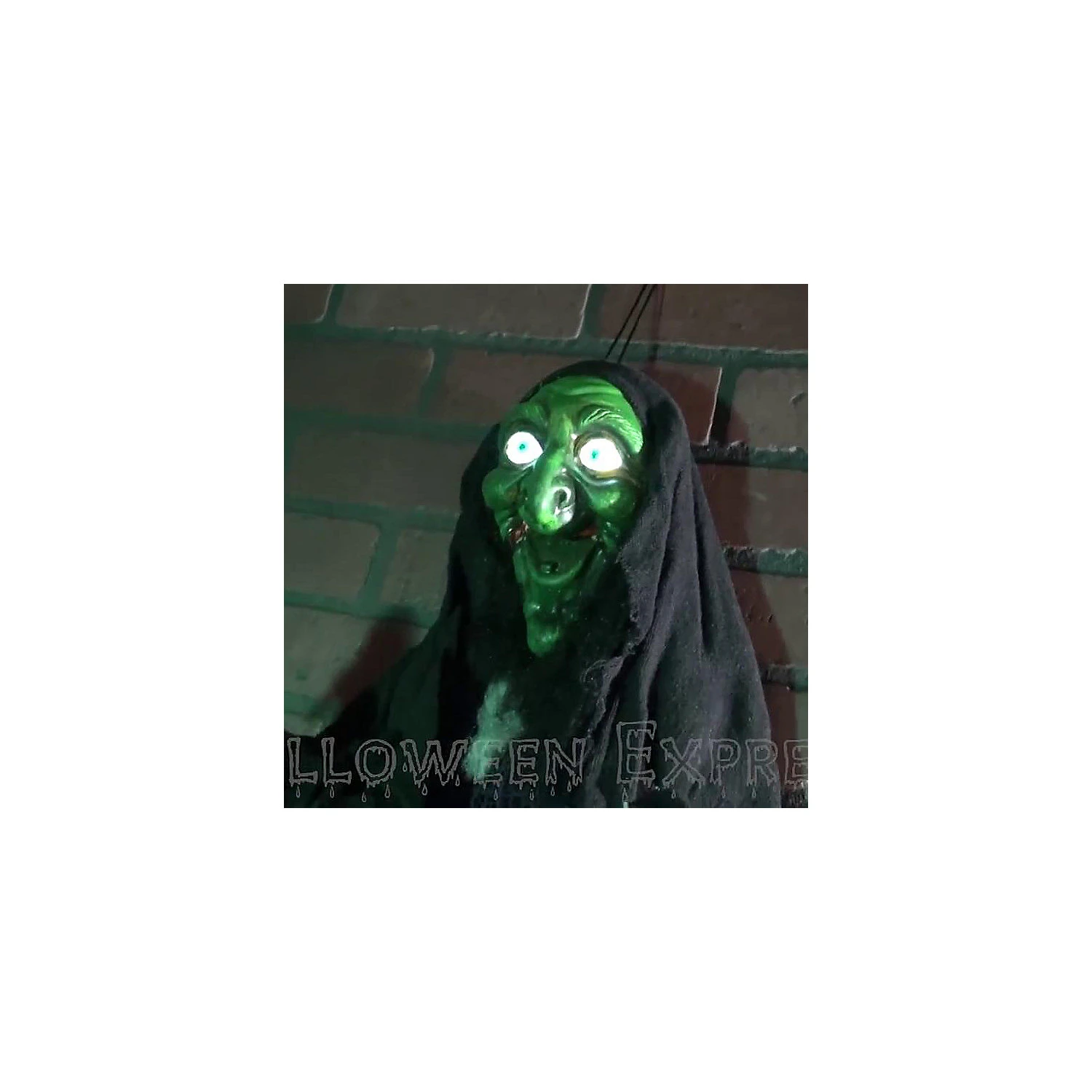 Incredibly green Talking Witch will be so much fun at your next Halloween party! Her black and purple robes set off her green hands perfectly, her eyes light up with a white light, and her jaw moves as she talks! There is a sound control along with a Try Me button. Requires 3 AAA batteries, included. Measures approximately 31.5″x 4.3″x 47.2in. Made of iron wire(5%), polyester(50%), plastic (PE)40%, polyethylene foam(5%).Special Shipping Information: This item ships separately from other items in your order. This item cannot ship to a P.O. Box. This item may be subject to additional processing days.ITEM IS NOT ELIGIBLE FOR EXPEDITED SHIPPING
