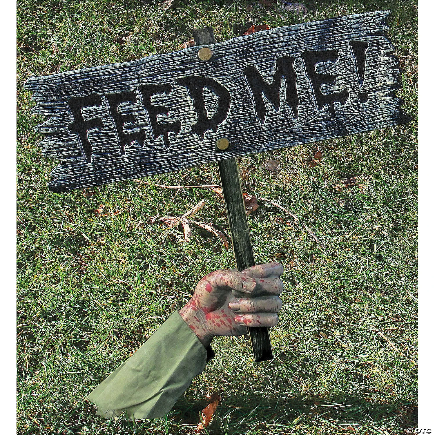 Give your guests the creeps with this message from the dead! An arm appears to be reaching up from the grave with a warning sign to all passersby! Includes the arm, sign with pole, and ground stake. Add a few tombstones and you have a spooky outdoor graveyard scene. Sign says Feed Me! Signs measure 18 inches tall x 19 inches wide x 3 inches deep.